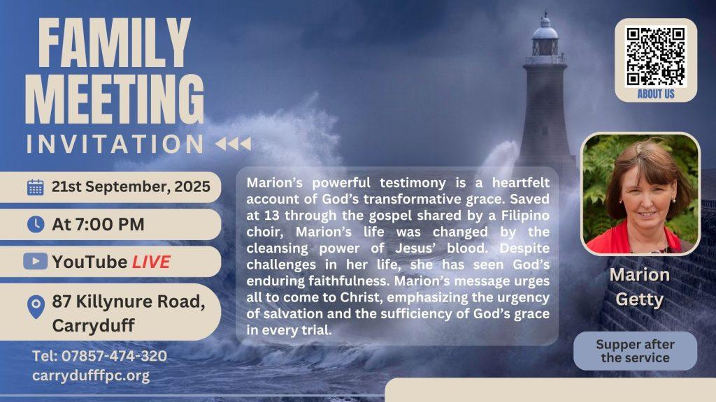 Invitation Join with us to hear Marion Getty’s testimony at Carryduff Free Presbyterian Church on Sunday 21st September at 7pm.