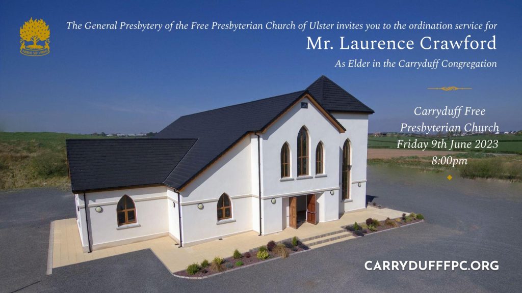 The General Presbytery of the Free Presbyterian Church of Ulster invites you to the ordination service for Mr. Laurence Crawford as