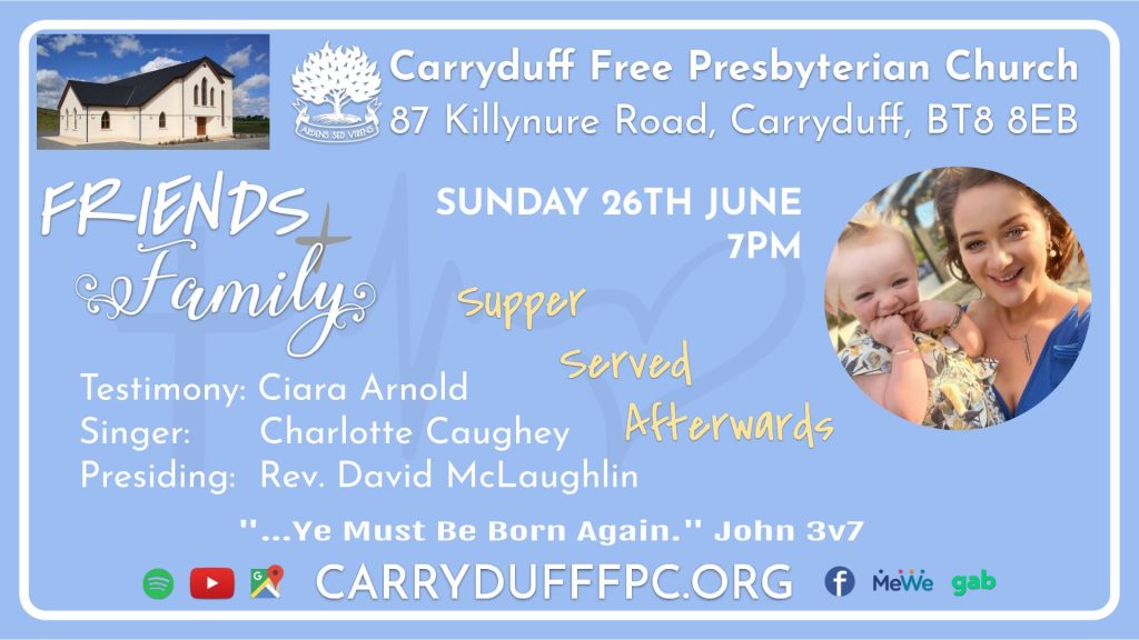 Date: Sunday 19th February 2023 at 7:00pmVenue: Carryduff Free Presbyterian ChurchSupper: Served Afterwards Victor Maxwell was brought up on the
