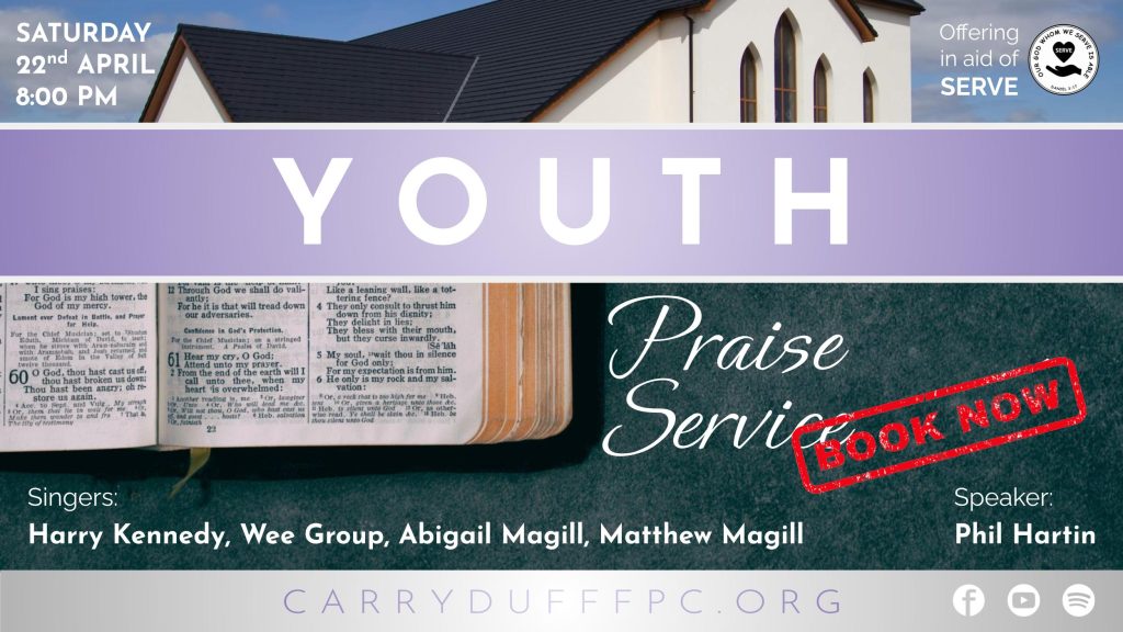 You are cordially invited to attend a Youth Praise Service on Saturday 22nd April at 8PM. Taking part will be