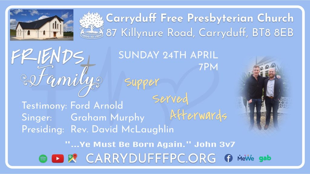 Date: Sun 7:00M 24th April 2022Soloist: Graham MurphyTestimony: Ford ArnoldPresiding: Rev. David McLaughlin