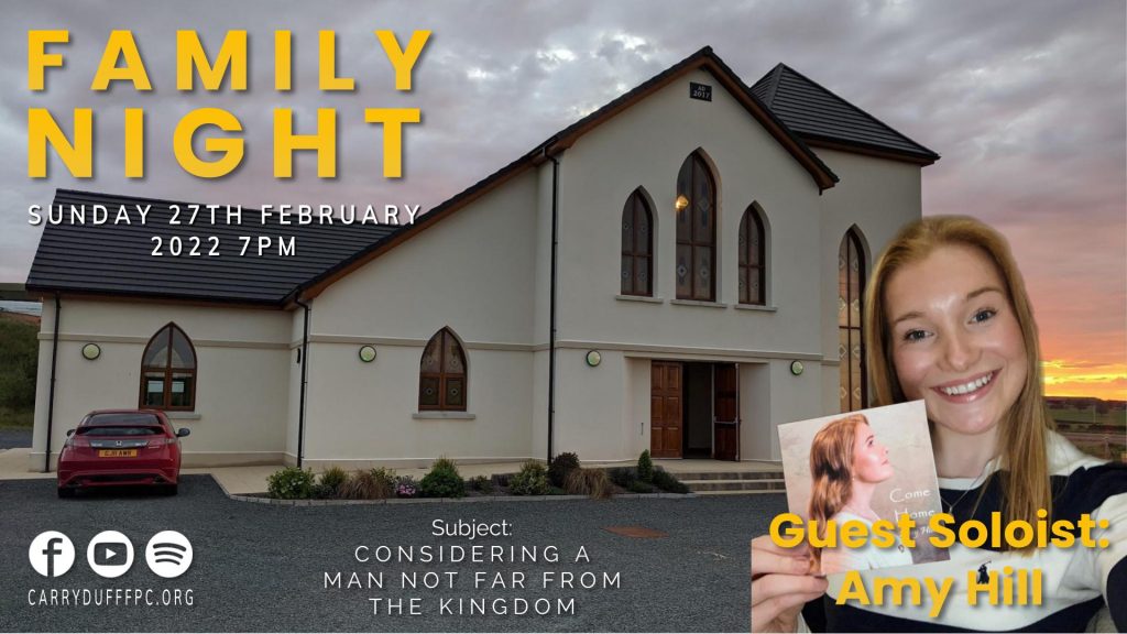 Date: Sun 7:00PM 27th February 2022Soloist: Amy HillPreacher: Rev. David McLaughlinBible Reference: Mark 12:34 And when Jesus saw that he