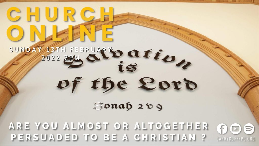 Date: Sun 7:00 PM 13th February 2022Preacher: Rev. David McLaughlinBible Reference: Acts 26:28-29 28 Then Agrippa said unto Paul, Almost