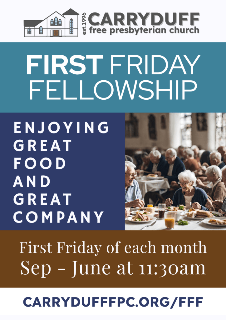 From September to June, on the first Friday of the month (D.V), we invite the more senior members and friends of our church to join with us in fellowship around a meal and the Word of God. All are welcome to attend.