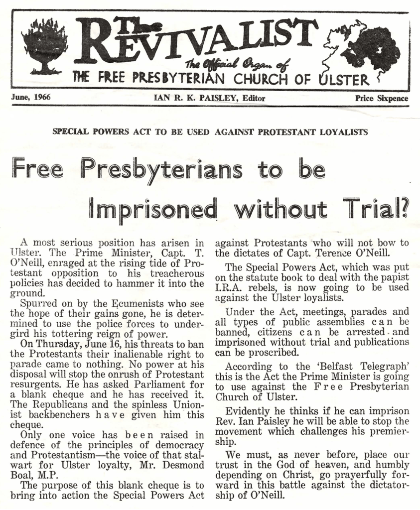 • Belfast Telegraph Leader, 29 June 1966: “Dr Paisley repudiates the gun.”