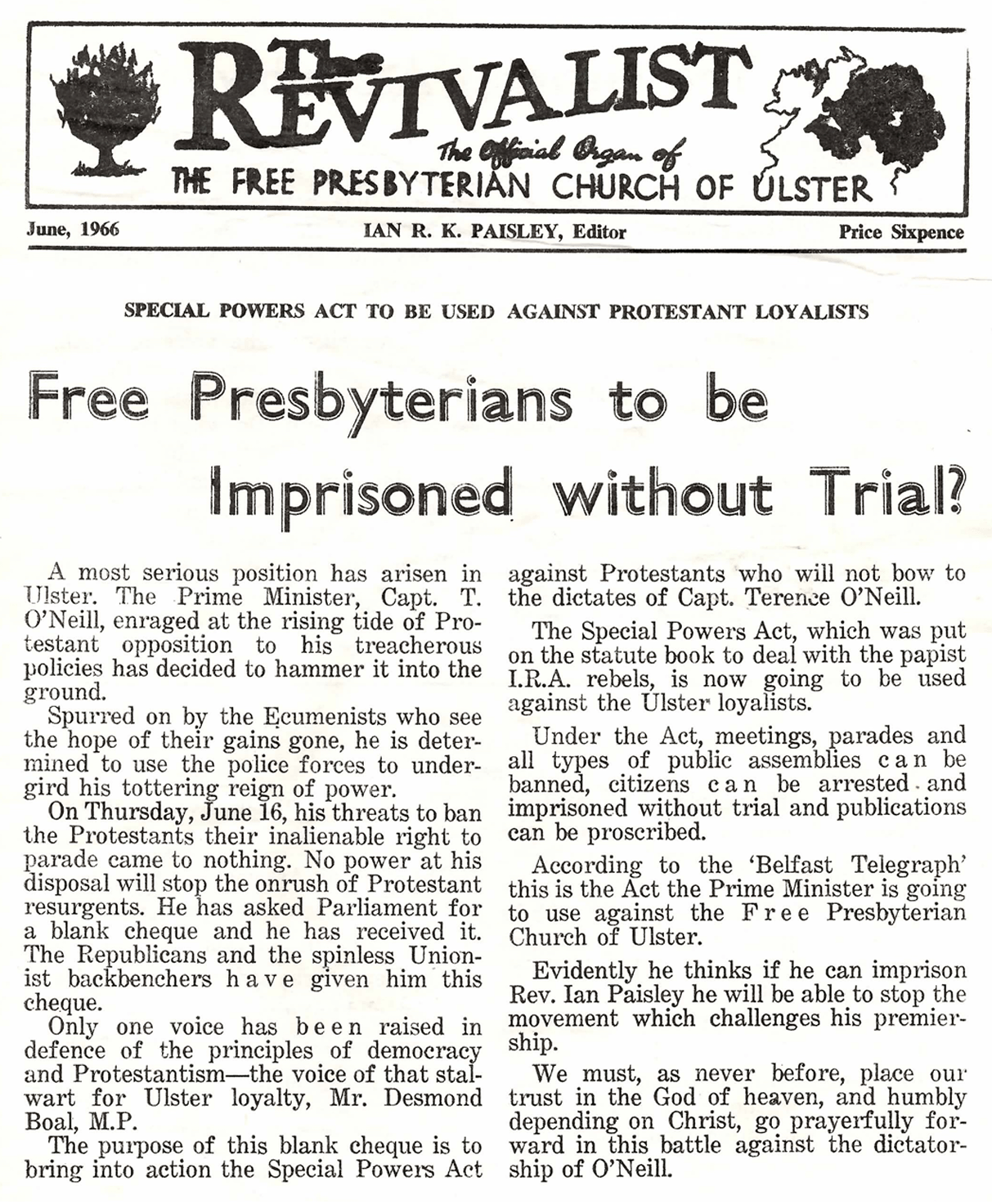 • Belfast Telegraph Leader, 29 June 1966: “Dr Paisley repudiates the gun.”