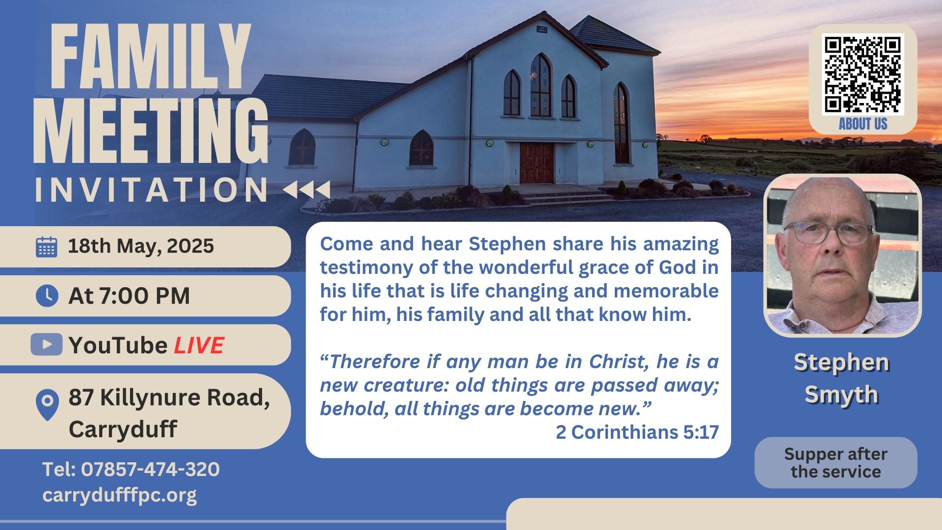 We would like to invite you to our family night service on Sunday 18th May at 7pm. Come and hear Stephen share his amazing testimony of the wonderful grace of God in his life that is life changing and memorable for him, his family and all that know him.