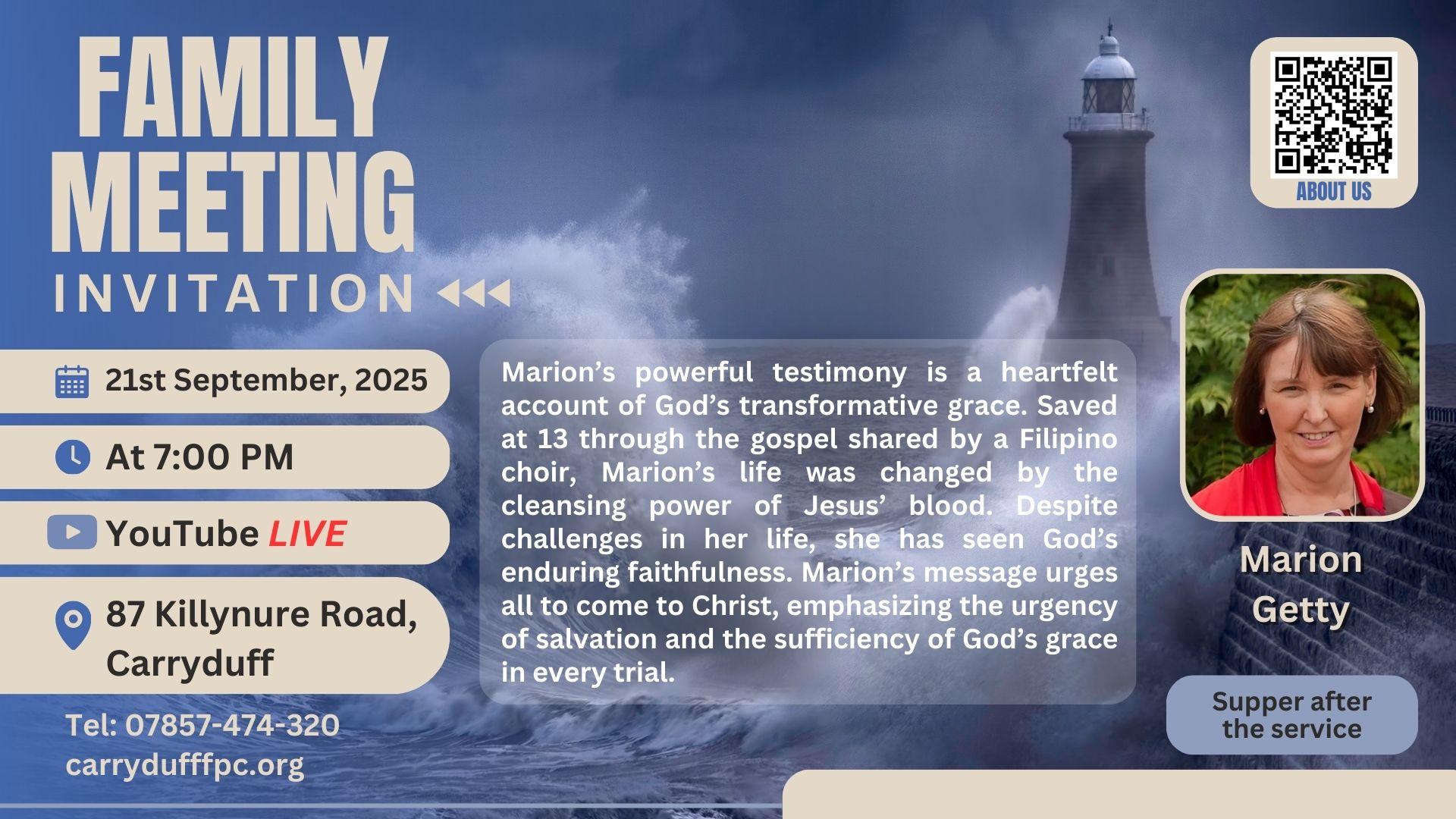 Join with us to hear Marion Getty’s testimony at Carryduff Free Presbyterian Church on Sunday 21st September at 7pm. Marion’s powerful testimony is a heartfelt account of God’s transformative grace.