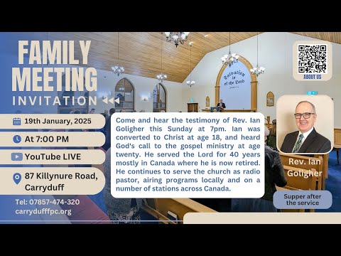 Come and hear the testimony of Rev. Ian Goligher this Sunday at 7pm. Ian was converted to Christ at age 18, and heard God’s call to the gospel ministry at age twenty. He served the Lord for 40 years mostly in Canada where he is now retired. He continues to serve the church as radio pastor, airing programs locally and on a number of stations across Canada.