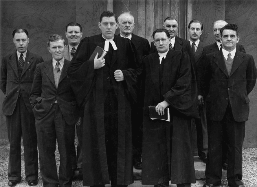 In February 1951, elders from Lissara Presbyterian Church were suspended by the Down Presbytery for wishing to hold a Gospel mission in their church hall led by a young evangelist, Ian Paisley. This rift resulted in the mission going ahead in Killyleagh Street Mission Hall with 94 precious souls saved and professing faith in the Lord Jesus Christ. Following the mission, the Free Presbyterian Church of Ulster was founded on 17th March 1951 in Crossgar by Rev. Ian Paisley and a committee of local members pictured below.